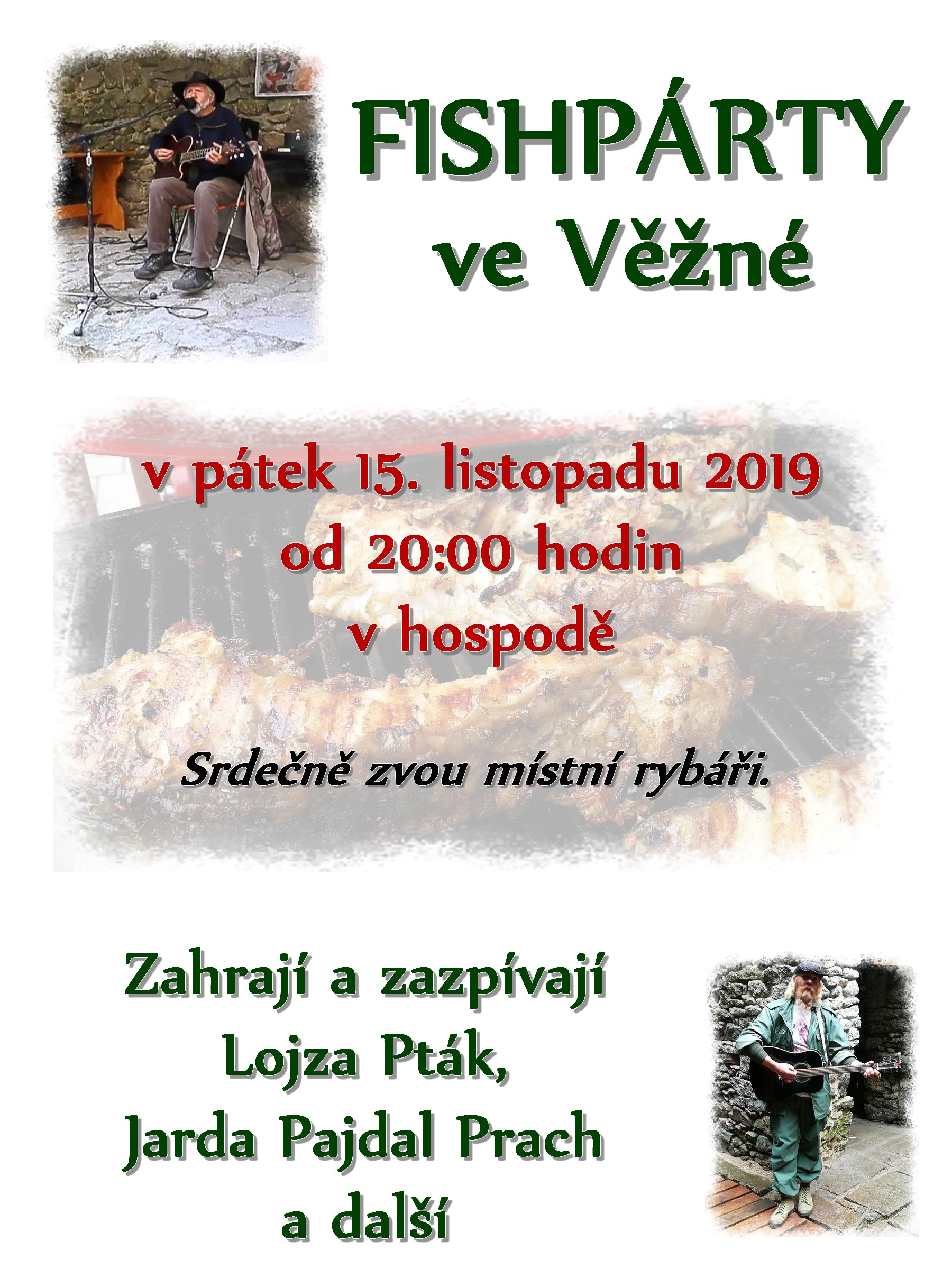 | 15.11.2019 | Fishpárty | V pátek 15. 11. 2019 bude ve Věženské hospodě milo. Grilované ryby, další rybí pochoutky, muzika jako řemen... Zahrají a zazpívají Lojza Pták, Jarda Pajdal Prach a další. Bude fajn, tak přijďte! Začíná se ve 20:00 hodin. Srdečně zvou místní rybáři. Plakát s podrobnějšími informacemi je k dispozici zde (733 kB). |