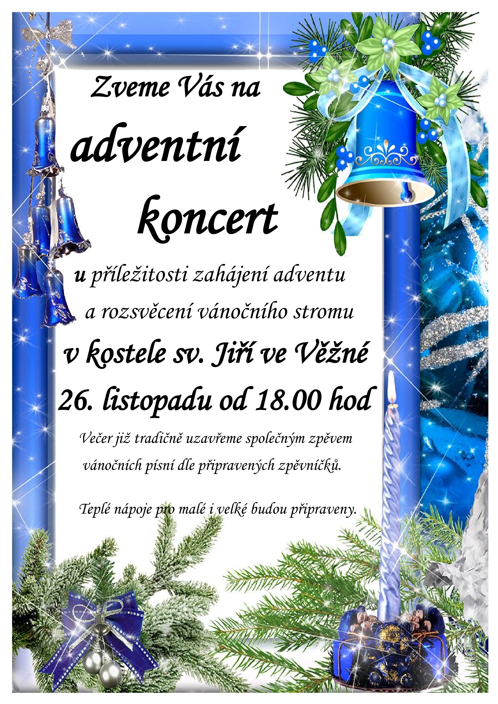 | 26.11.2022 | Adventní koncert | V sobotu 26. 11. 2022 zahájíme advent koncertem žáků ZUŠ Pacov v kostele sv. Jiří ve Věžné. Začátek koncertu je v 18:00 hodin, poté dojde k rozsvícení vánočního stromu před farou. Jste sdrdečně zváni. Plakát s podrobnějšími informacemi je k dispozici zde (2,5 MB). |