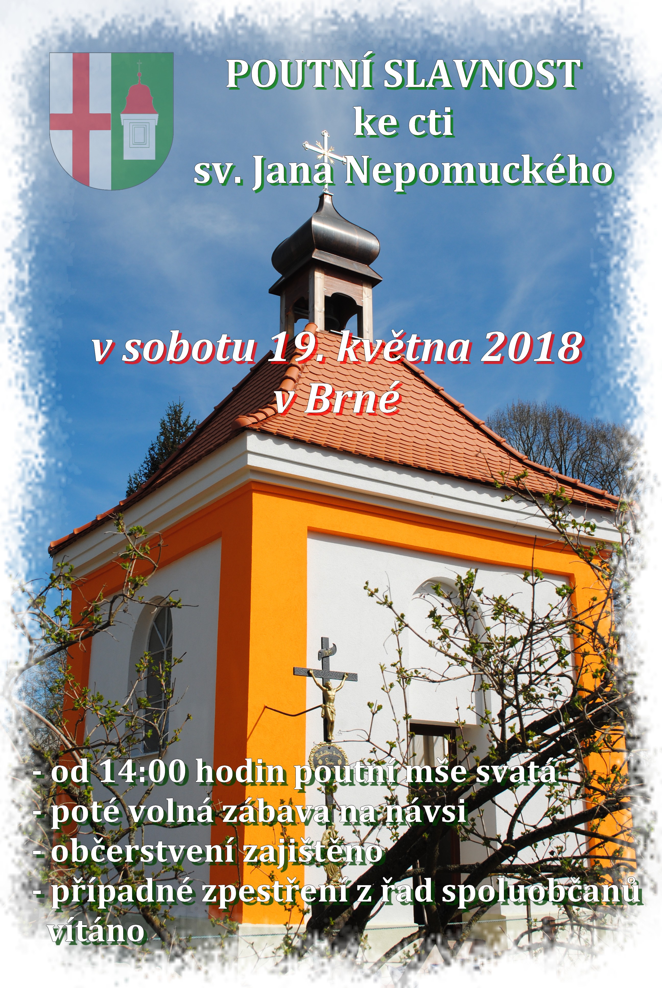 | 18.5.2019 | Pouť v Brné | V sobotu 18.5.2019 se v Brné na návsi uskuteční poutní slavnost ke cti sv. Jana Nepomuckého. Slavnost započne mší svatou ve 14:00 hodin. Srdečně zveme! Plakát ve formátu JPG je k dispozici zde (762 kB). |