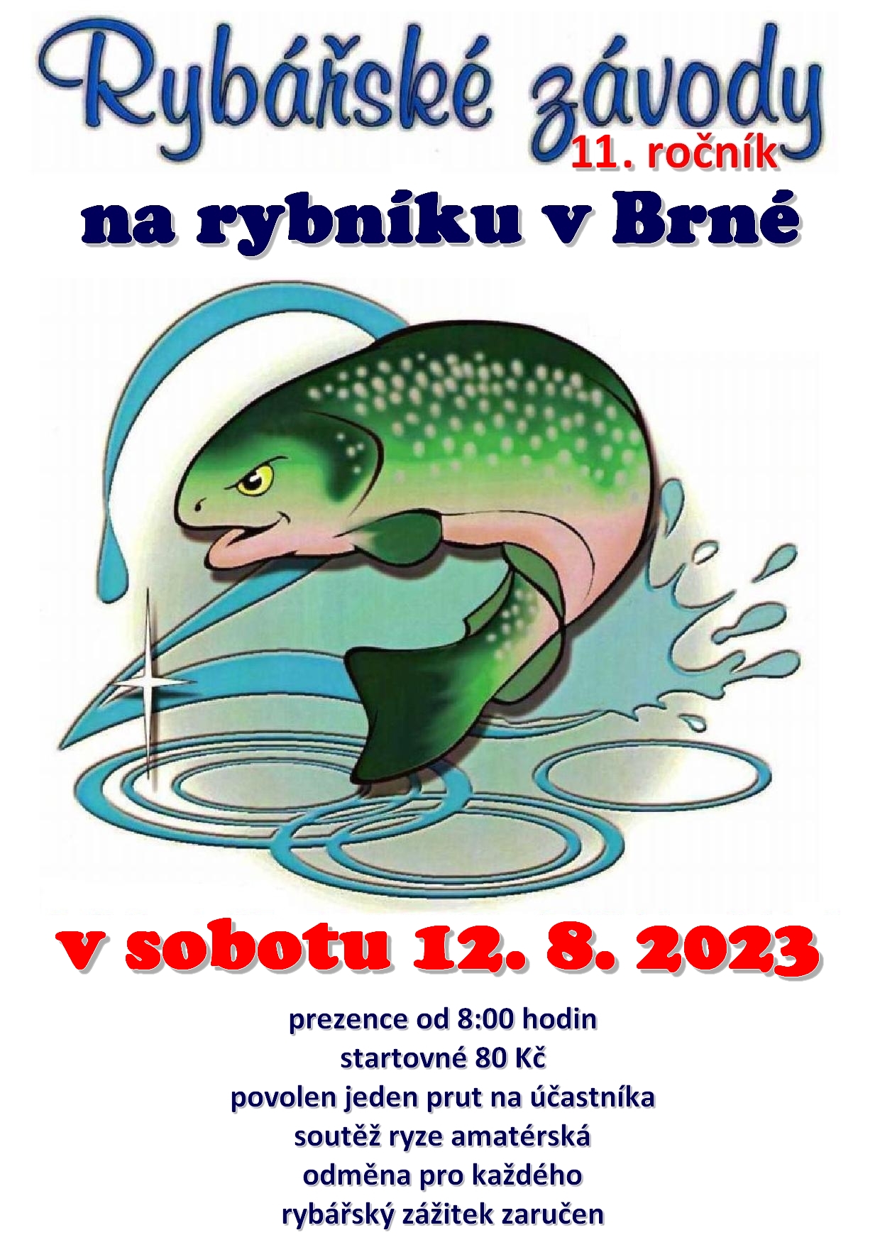 | 12.8.2023 | Rybářské závody v Brné | V sobotu 12. 8. 2023 se uskuteční 11. ročník rybářských závodů u rybníka v Brné. Prezence účastníků bude od 8:00 hodin. Všichni jsou srdečně zváni! Plakát s podrobnějšími informacemi je k dispozici zde (751 kB). |