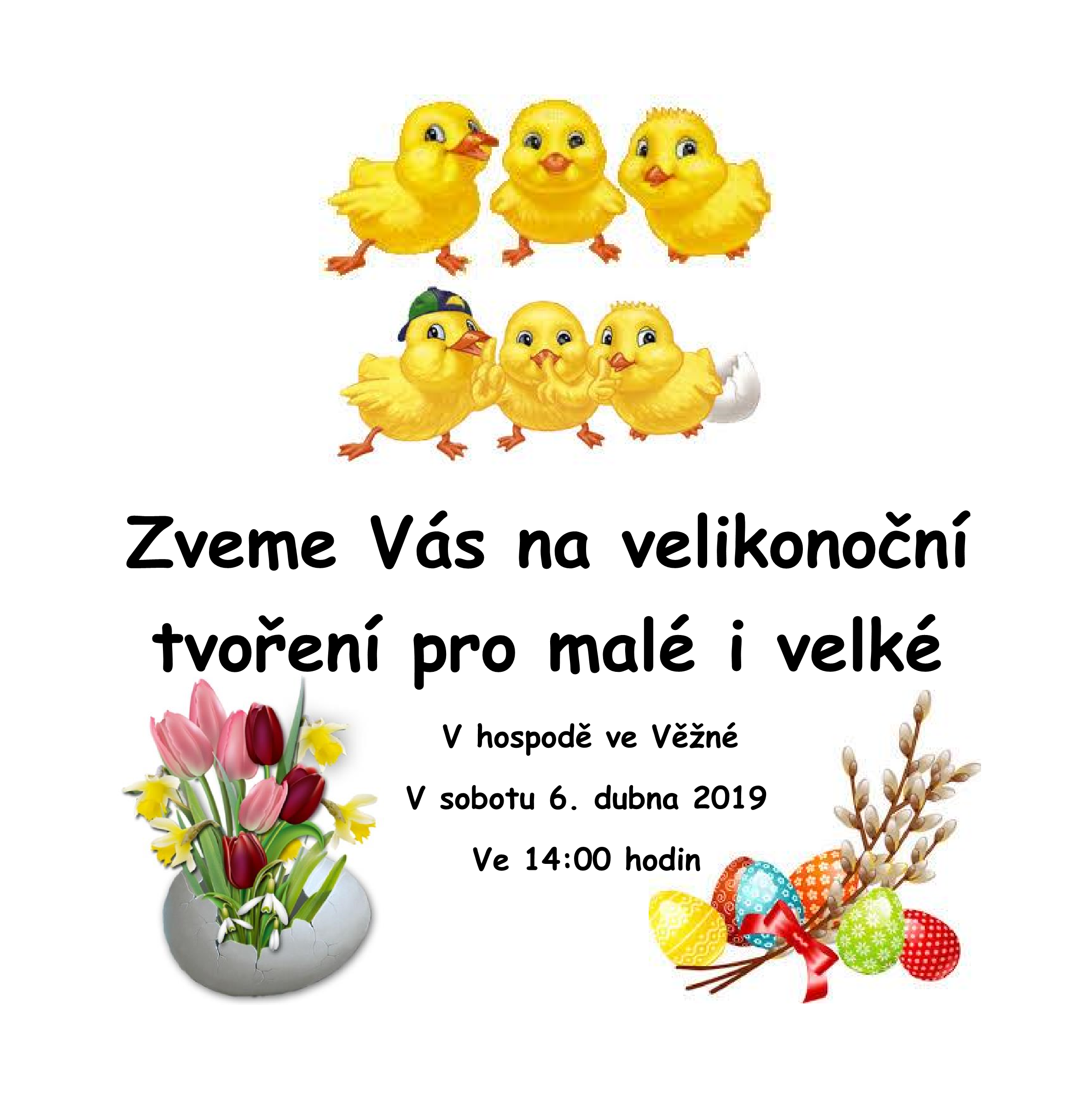 | 6.4.2019 | Velikonoční tvoření | Srdečně vás zveme na velikonoční tvoření pro malé i velké. Uskuteční se v sobotu 6. dubna 2019 od 14:00 hodin v hospodě ve Věžné. Plakát ve formátu PNG je k dispozici zde (807 kB). |